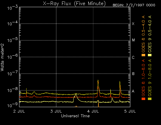 The operational data in the graph above has been modified to remove the scaling factor that has been applied by the Space Weather Prediction Center (SWPC). Because of the SWPC scaling factor in the operational data, flare indices for the operational data were reported as 42% smaller than for the science quality data. The scaling factor has also been removed from the solar flare list to reflect the true physical units.