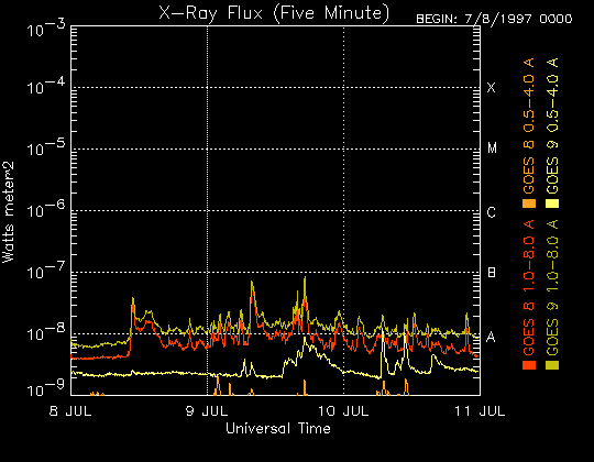 The operational data in the graph above has been modified to remove the scaling factor that has been applied by the Space Weather Prediction Center (SWPC). Because of the SWPC scaling factor in the operational data, flare indices for the operational data were reported as 42% smaller than for the science quality data. The scaling factor has also been removed from the solar flare list to reflect the true physical units.