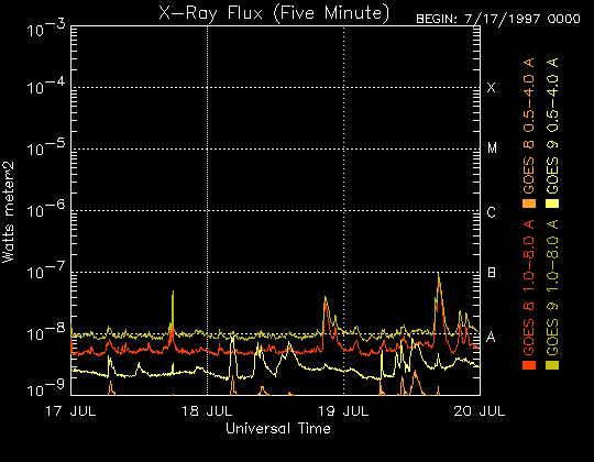 The operational data in the graph above has been modified to remove the scaling factor that has been applied by the Space Weather Prediction Center (SWPC). Because of the SWPC scaling factor in the operational data, flare indices for the operational data were reported as 42% smaller than for the science quality data. The scaling factor has also been removed from the solar flare list to reflect the true physical units.