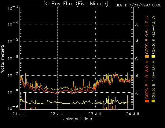 The operational data in the graph above has been modified to remove the scaling factor that has been applied by the Space Weather Prediction Center (SWPC). Because of the SWPC scaling factor in the operational data, flare indices for the operational data were reported as 42% smaller than for the science quality data. The scaling factor has also been removed from the solar flare list to reflect the true physical units.