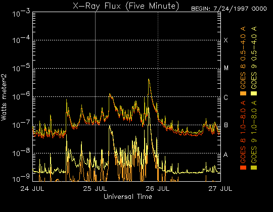 The operational data in the graph above has been modified to remove the scaling factor that has been applied by the Space Weather Prediction Center (SWPC). Because of the SWPC scaling factor in the operational data, flare indices for the operational data were reported as 42% smaller than for the science quality data. The scaling factor has also been removed from the solar flare list to reflect the true physical units.