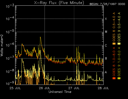 The operational data in the graph above has been modified to remove the scaling factor that has been applied by the Space Weather Prediction Center (SWPC). Because of the SWPC scaling factor in the operational data, flare indices for the operational data were reported as 42% smaller than for the science quality data. The scaling factor has also been removed from the solar flare list to reflect the true physical units.