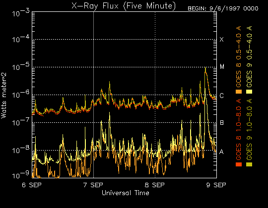 The operational data in the graph above has been modified to remove the scaling factor that has been applied by the Space Weather Prediction Center (SWPC). Because of the SWPC scaling factor in the operational data, flare indices for the operational data were reported as 42% smaller than for the science quality data. The scaling factor has also been removed from the solar flare list to reflect the true physical units.