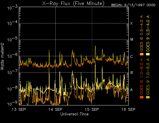 The operational data in the graph above has been modified to remove the scaling factor that has been applied by the Space Weather Prediction Center (SWPC). Because of the SWPC scaling factor in the operational data, flare indices for the operational data were reported as 42% smaller than for the science quality data. The scaling factor has also been removed from the solar flare list to reflect the true physical units.