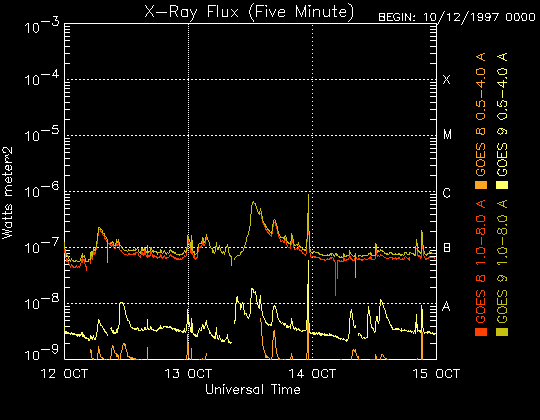 The operational data in the graph above has been modified to remove the scaling factor that has been applied by the Space Weather Prediction Center (SWPC). Because of the SWPC scaling factor in the operational data, flare indices for the operational data were reported as 42% smaller than for the science quality data. The scaling factor has also been removed from the solar flare list to reflect the true physical units.