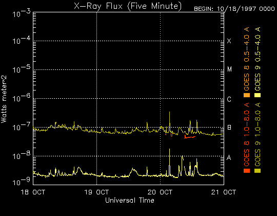 The operational data in the graph above has been modified to remove the scaling factor that has been applied by the Space Weather Prediction Center (SWPC). Because of the SWPC scaling factor in the operational data, flare indices for the operational data were reported as 42% smaller than for the science quality data. The scaling factor has also been removed from the solar flare list to reflect the true physical units.