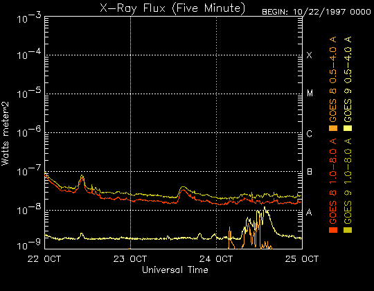 The operational data in the graph above has been modified to remove the scaling factor that has been applied by the Space Weather Prediction Center (SWPC). Because of the SWPC scaling factor in the operational data, flare indices for the operational data were reported as 42% smaller than for the science quality data. The scaling factor has also been removed from the solar flare list to reflect the true physical units.