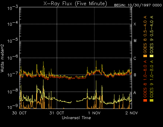 The operational data in the graph above has been modified to remove the scaling factor that has been applied by the Space Weather Prediction Center (SWPC). Because of the SWPC scaling factor in the operational data, flare indices for the operational data were reported as 42% smaller than for the science quality data. The scaling factor has also been removed from the solar flare list to reflect the true physical units.