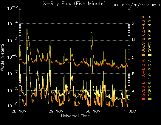 The operational data in the graph above has been modified to remove the scaling factor that has been applied by the Space Weather Prediction Center (SWPC). Because of the SWPC scaling factor in the operational data, flare indices for the operational data were reported as 42% smaller than for the science quality data. The scaling factor has also been removed from the solar flare list to reflect the true physical units.