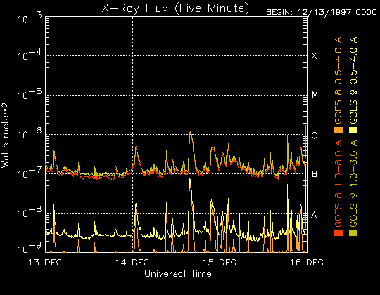 The operational data in the graph above has been modified to remove the scaling factor that has been applied by the Space Weather Prediction Center (SWPC). Because of the SWPC scaling factor in the operational data, flare indices for the operational data were reported as 42% smaller than for the science quality data. The scaling factor has also been removed from the solar flare list to reflect the true physical units.