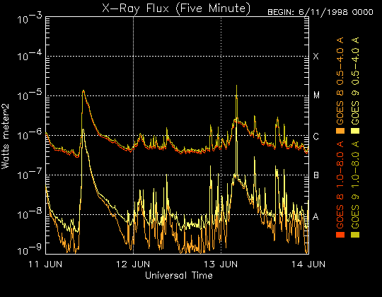 The operational data in the graph above has been modified to remove the scaling factor that has been applied by the Space Weather Prediction Center (SWPC). Because of the SWPC scaling factor in the operational data, flare indices for the operational data were reported as 42% smaller than for the science quality data. The scaling factor has also been removed from the solar flare list to reflect the true physical units.