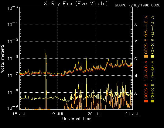 The operational data in the graph above has been modified to remove the scaling factor that has been applied by the Space Weather Prediction Center (SWPC). Because of the SWPC scaling factor in the operational data, flare indices for the operational data were reported as 42% smaller than for the science quality data. The scaling factor has also been removed from the solar flare list to reflect the true physical units.