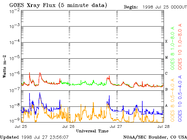 The operational data in the graph above has been modified to remove the scaling factor that has been applied by the Space Weather Prediction Center (SWPC). Because of the SWPC scaling factor in the operational data, flare indices for the operational data were reported as 42% smaller than for the science quality data. The scaling factor has also been removed from the solar flare list to reflect the true physical units.