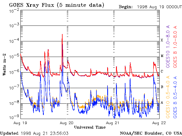 The operational data in the graph above has been modified to remove the scaling factor that has been applied by the Space Weather Prediction Center (SWPC). Because of the SWPC scaling factor in the operational data, flare indices for the operational data were reported as 42% smaller than for the science quality data. The scaling factor has also been removed from the solar flare list to reflect the true physical units.