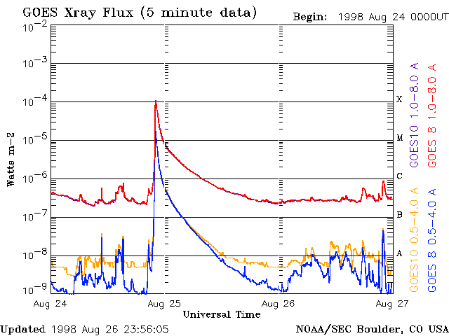 The operational data in the graph above has been modified to remove the scaling factor that has been applied by the Space Weather Prediction Center (SWPC). Because of the SWPC scaling factor in the operational data, flare indices for the operational data were reported as 42% smaller than for the science quality data. The scaling factor has also been removed from the solar flare list to reflect the true physical units.
