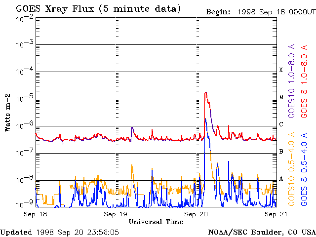 The operational data in the graph above has been modified to remove the scaling factor that has been applied by the Space Weather Prediction Center (SWPC). Because of the SWPC scaling factor in the operational data, flare indices for the operational data were reported as 42% smaller than for the science quality data. The scaling factor has also been removed from the solar flare list to reflect the true physical units.