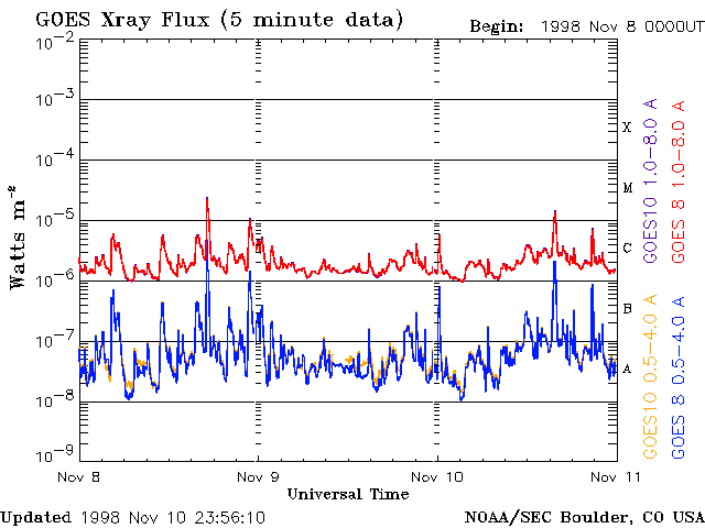 The operational data in the graph above has been modified to remove the scaling factor that has been applied by the Space Weather Prediction Center (SWPC). Because of the SWPC scaling factor in the operational data, flare indices for the operational data were reported as 42% smaller than for the science quality data. The scaling factor has also been removed from the solar flare list to reflect the true physical units.