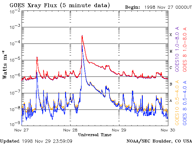 The operational data in the graph above has been modified to remove the scaling factor that has been applied by the Space Weather Prediction Center (SWPC). Because of the SWPC scaling factor in the operational data, flare indices for the operational data were reported as 42% smaller than for the science quality data. The scaling factor has also been removed from the solar flare list to reflect the true physical units.