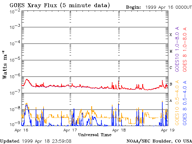 The operational data in the graph above has been modified to remove the scaling factor that has been applied by the Space Weather Prediction Center (SWPC). Because of the SWPC scaling factor in the operational data, flare indices for the operational data were reported as 42% smaller than for the science quality data. The scaling factor has also been removed from the solar flare list to reflect the true physical units.