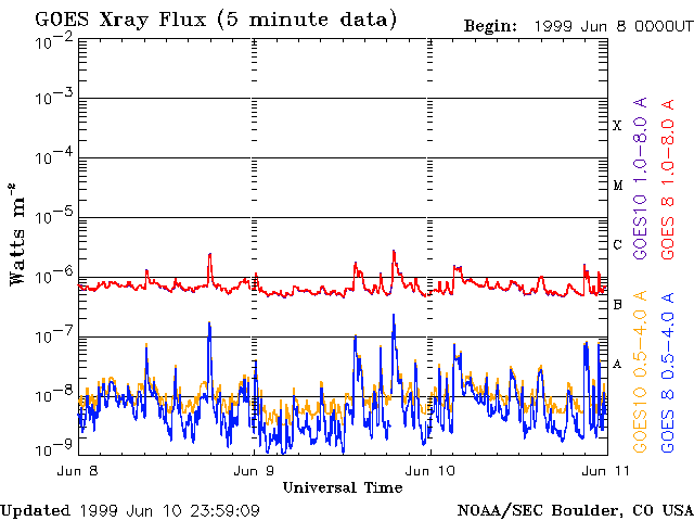 The operational data in the graph above has been modified to remove the scaling factor that has been applied by the Space Weather Prediction Center (SWPC). Because of the SWPC scaling factor in the operational data, flare indices for the operational data were reported as 42% smaller than for the science quality data. The scaling factor has also been removed from the solar flare list to reflect the true physical units.