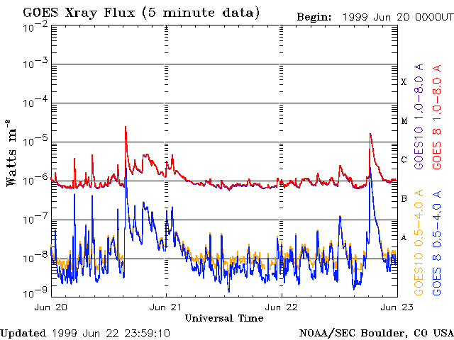 The operational data in the graph above has been modified to remove the scaling factor that has been applied by the Space Weather Prediction Center (SWPC). Because of the SWPC scaling factor in the operational data, flare indices for the operational data were reported as 42% smaller than for the science quality data. The scaling factor has also been removed from the solar flare list to reflect the true physical units.
