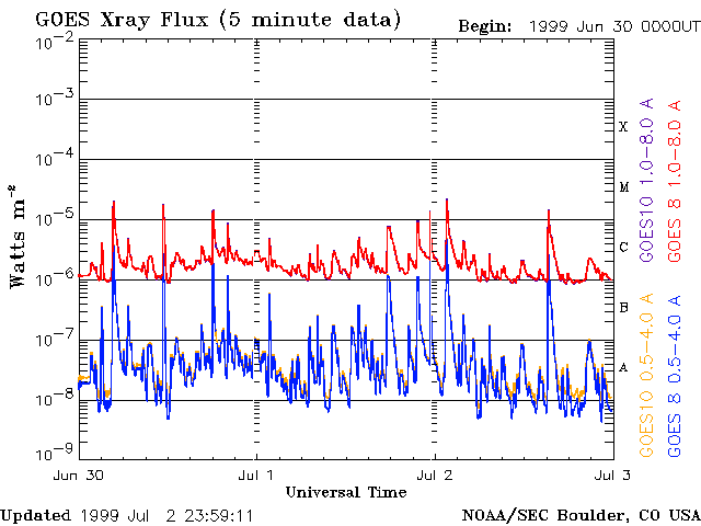 The operational data in the graph above has been modified to remove the scaling factor that has been applied by the Space Weather Prediction Center (SWPC). Because of the SWPC scaling factor in the operational data, flare indices for the operational data were reported as 42% smaller than for the science quality data. The scaling factor has also been removed from the solar flare list to reflect the true physical units.