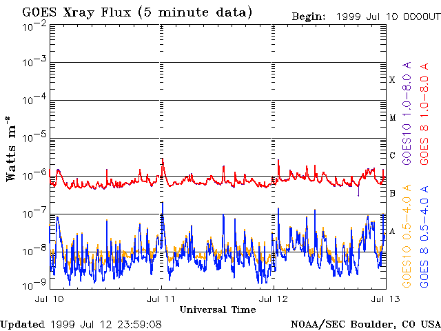 The operational data in the graph above has been modified to remove the scaling factor that has been applied by the Space Weather Prediction Center (SWPC). Because of the SWPC scaling factor in the operational data, flare indices for the operational data were reported as 42% smaller than for the science quality data. The scaling factor has also been removed from the solar flare list to reflect the true physical units.