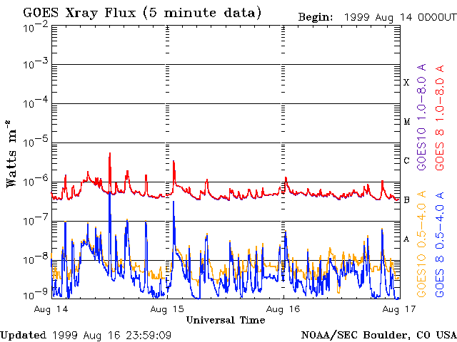 The operational data in the graph above has been modified to remove the scaling factor that has been applied by the Space Weather Prediction Center (SWPC). Because of the SWPC scaling factor in the operational data, flare indices for the operational data were reported as 42% smaller than for the science quality data. The scaling factor has also been removed from the solar flare list to reflect the true physical units.