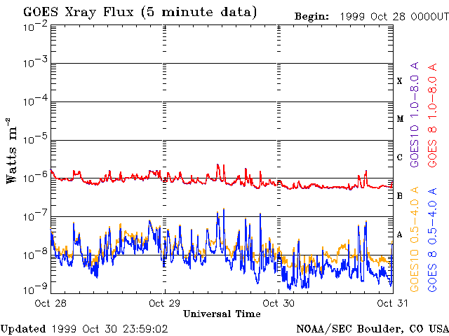 The operational data in the graph above has been modified to remove the scaling factor that has been applied by the Space Weather Prediction Center (SWPC). Because of the SWPC scaling factor in the operational data, flare indices for the operational data were reported as 42% smaller than for the science quality data. The scaling factor has also been removed from the solar flare list to reflect the true physical units.