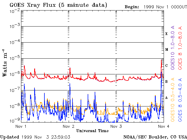 The operational data in the graph above has been modified to remove the scaling factor that has been applied by the Space Weather Prediction Center (SWPC). Because of the SWPC scaling factor in the operational data, flare indices for the operational data were reported as 42% smaller than for the science quality data. The scaling factor has also been removed from the solar flare list to reflect the true physical units.