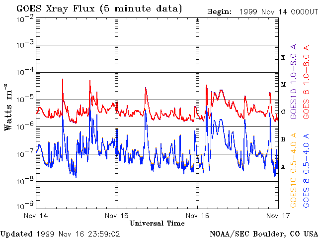 The operational data in the graph above has been modified to remove the scaling factor that has been applied by the Space Weather Prediction Center (SWPC). Because of the SWPC scaling factor in the operational data, flare indices for the operational data were reported as 42% smaller than for the science quality data. The scaling factor has also been removed from the solar flare list to reflect the true physical units.