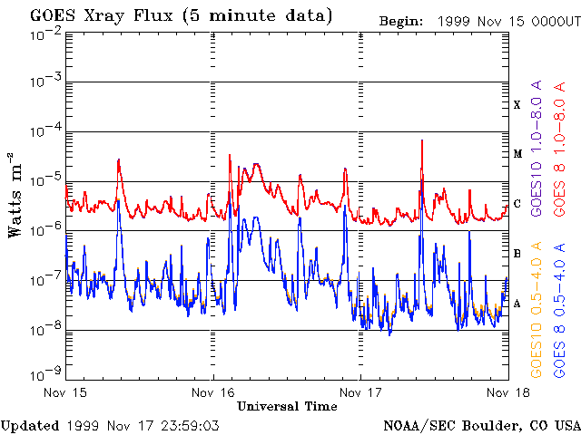The operational data in the graph above has been modified to remove the scaling factor that has been applied by the Space Weather Prediction Center (SWPC). Because of the SWPC scaling factor in the operational data, flare indices for the operational data were reported as 42% smaller than for the science quality data. The scaling factor has also been removed from the solar flare list to reflect the true physical units.