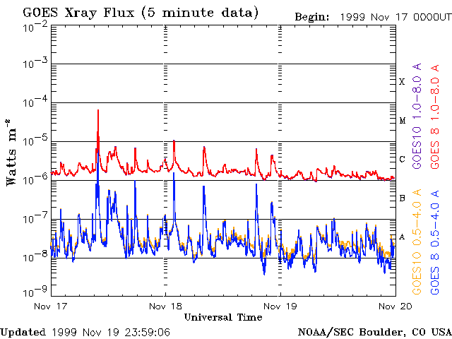 The operational data in the graph above has been modified to remove the scaling factor that has been applied by the Space Weather Prediction Center (SWPC). Because of the SWPC scaling factor in the operational data, flare indices for the operational data were reported as 42% smaller than for the science quality data. The scaling factor has also been removed from the solar flare list to reflect the true physical units.