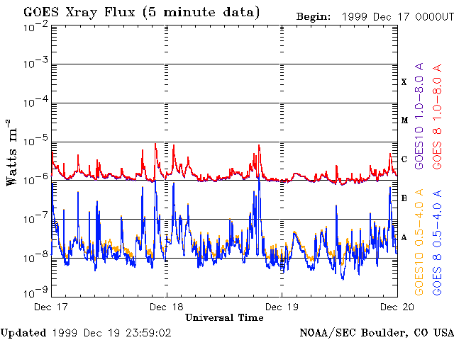 The operational data in the graph above has been modified to remove the scaling factor that has been applied by the Space Weather Prediction Center (SWPC). Because of the SWPC scaling factor in the operational data, flare indices for the operational data were reported as 42% smaller than for the science quality data. The scaling factor has also been removed from the solar flare list to reflect the true physical units.