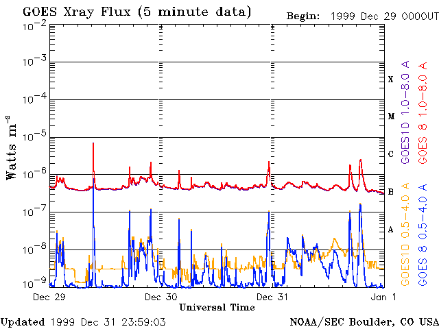 The operational data in the graph above has been modified to remove the scaling factor that has been applied by the Space Weather Prediction Center (SWPC). Because of the SWPC scaling factor in the operational data, flare indices for the operational data were reported as 42% smaller than for the science quality data. The scaling factor has also been removed from the solar flare list to reflect the true physical units.