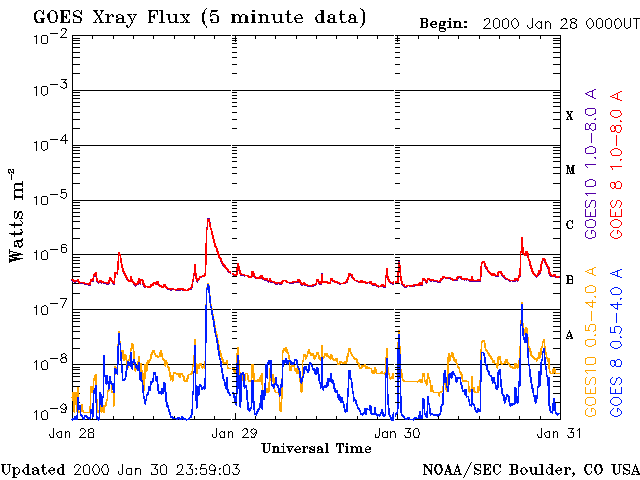The operational data in the graph above has been modified to remove the scaling factor that has been applied by the Space Weather Prediction Center (SWPC). Because of the SWPC scaling factor in the operational data, flare indices for the operational data were reported as 42% smaller than for the science quality data. The scaling factor has also been removed from the solar flare list to reflect the true physical units.