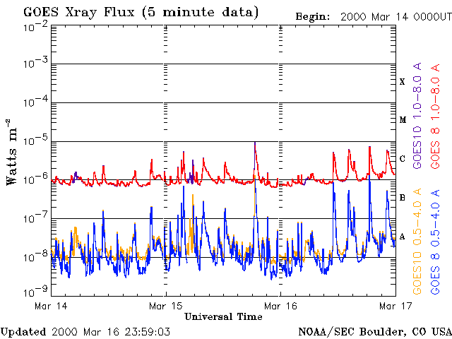 The operational data in the graph above has been modified to remove the scaling factor that has been applied by the Space Weather Prediction Center (SWPC). Because of the SWPC scaling factor in the operational data, flare indices for the operational data were reported as 42% smaller than for the science quality data. The scaling factor has also been removed from the solar flare list to reflect the true physical units.