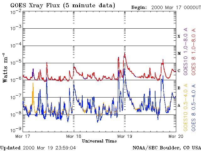 The operational data in the graph above has been modified to remove the scaling factor that has been applied by the Space Weather Prediction Center (SWPC). Because of the SWPC scaling factor in the operational data, flare indices for the operational data were reported as 42% smaller than for the science quality data. The scaling factor has also been removed from the solar flare list to reflect the true physical units.