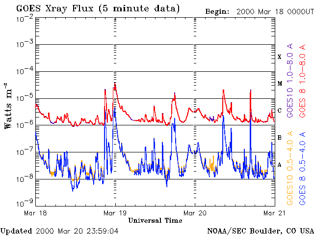 The operational data in the graph above has been modified to remove the scaling factor that has been applied by the Space Weather Prediction Center (SWPC). Because of the SWPC scaling factor in the operational data, flare indices for the operational data were reported as 42% smaller than for the science quality data. The scaling factor has also been removed from the solar flare list to reflect the true physical units.