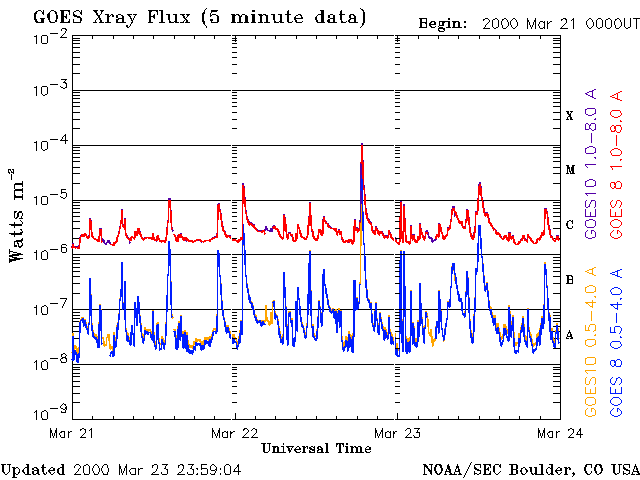 The operational data in the graph above has been modified to remove the scaling factor that has been applied by the Space Weather Prediction Center (SWPC). Because of the SWPC scaling factor in the operational data, flare indices for the operational data were reported as 42% smaller than for the science quality data. The scaling factor has also been removed from the solar flare list to reflect the true physical units.