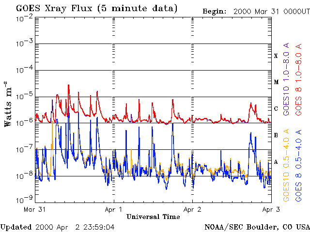 The operational data in the graph above has been modified to remove the scaling factor that has been applied by the Space Weather Prediction Center (SWPC). Because of the SWPC scaling factor in the operational data, flare indices for the operational data were reported as 42% smaller than for the science quality data. The scaling factor has also been removed from the solar flare list to reflect the true physical units.