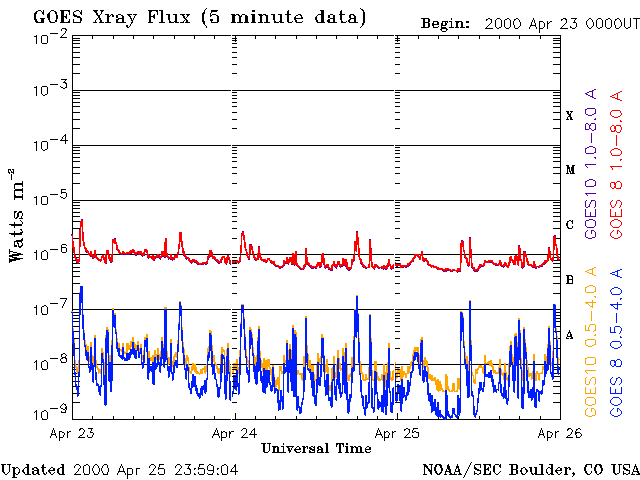 The operational data in the graph above has been modified to remove the scaling factor that has been applied by the Space Weather Prediction Center (SWPC). Because of the SWPC scaling factor in the operational data, flare indices for the operational data were reported as 42% smaller than for the science quality data. The scaling factor has also been removed from the solar flare list to reflect the true physical units.