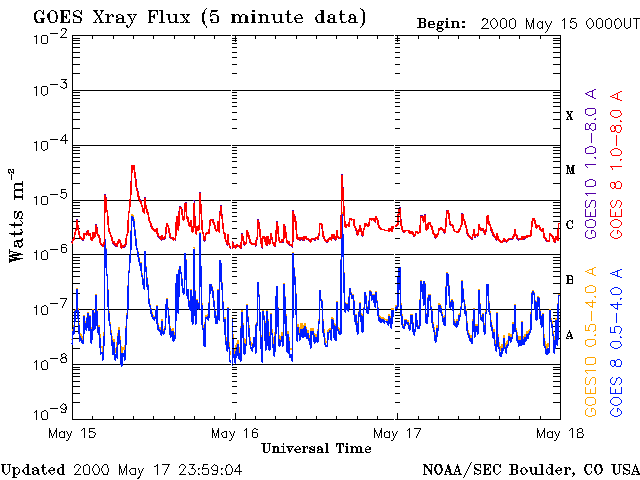 The operational data in the graph above has been modified to remove the scaling factor that has been applied by the Space Weather Prediction Center (SWPC). Because of the SWPC scaling factor in the operational data, flare indices for the operational data were reported as 42% smaller than for the science quality data. The scaling factor has also been removed from the solar flare list to reflect the true physical units.