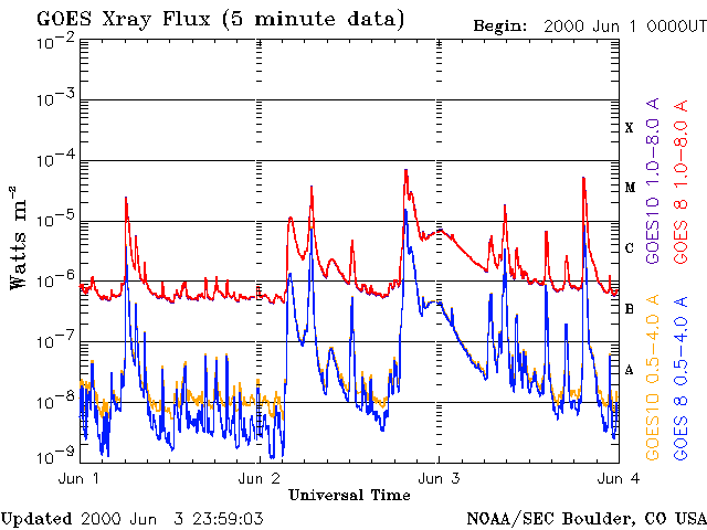 The operational data in the graph above has been modified to remove the scaling factor that has been applied by the Space Weather Prediction Center (SWPC). Because of the SWPC scaling factor in the operational data, flare indices for the operational data were reported as 42% smaller than for the science quality data. The scaling factor has also been removed from the solar flare list to reflect the true physical units.