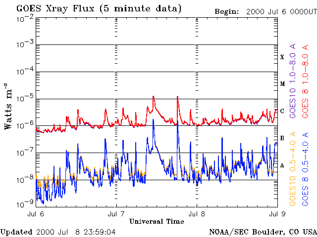 The operational data in the graph above has been modified to remove the scaling factor that has been applied by the Space Weather Prediction Center (SWPC). Because of the SWPC scaling factor in the operational data, flare indices for the operational data were reported as 42% smaller than for the science quality data. The scaling factor has also been removed from the solar flare list to reflect the true physical units.