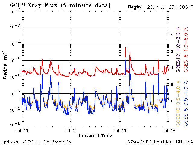 The operational data in the graph above has been modified to remove the scaling factor that has been applied by the Space Weather Prediction Center (SWPC). Because of the SWPC scaling factor in the operational data, flare indices for the operational data were reported as 42% smaller than for the science quality data. The scaling factor has also been removed from the solar flare list to reflect the true physical units.