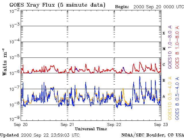 The operational data in the graph above has been modified to remove the scaling factor that has been applied by the Space Weather Prediction Center (SWPC). Because of the SWPC scaling factor in the operational data, flare indices for the operational data were reported as 42% smaller than for the science quality data. The scaling factor has also been removed from the solar flare list to reflect the true physical units.