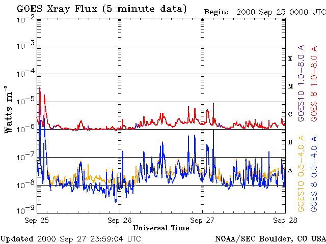 The operational data in the graph above has been modified to remove the scaling factor that has been applied by the Space Weather Prediction Center (SWPC). Because of the SWPC scaling factor in the operational data, flare indices for the operational data were reported as 42% smaller than for the science quality data. The scaling factor has also been removed from the solar flare list to reflect the true physical units.