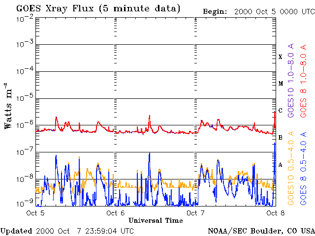 The operational data in the graph above has been modified to remove the scaling factor that has been applied by the Space Weather Prediction Center (SWPC). Because of the SWPC scaling factor in the operational data, flare indices for the operational data were reported as 42% smaller than for the science quality data. The scaling factor has also been removed from the solar flare list to reflect the true physical units.