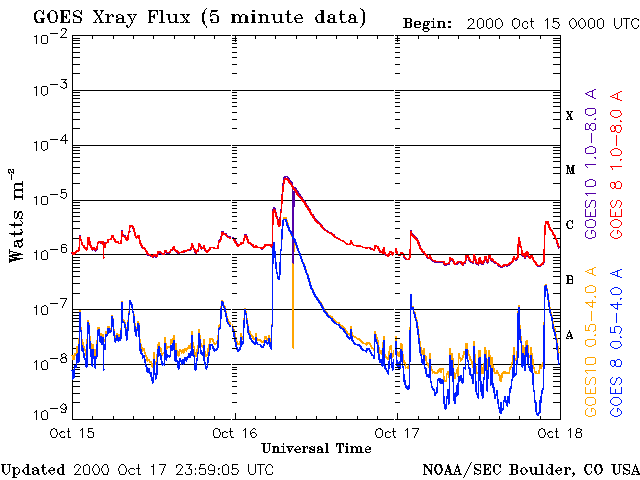 The operational data in the graph above has been modified to remove the scaling factor that has been applied by the Space Weather Prediction Center (SWPC). Because of the SWPC scaling factor in the operational data, flare indices for the operational data were reported as 42% smaller than for the science quality data. The scaling factor has also been removed from the solar flare list to reflect the true physical units.